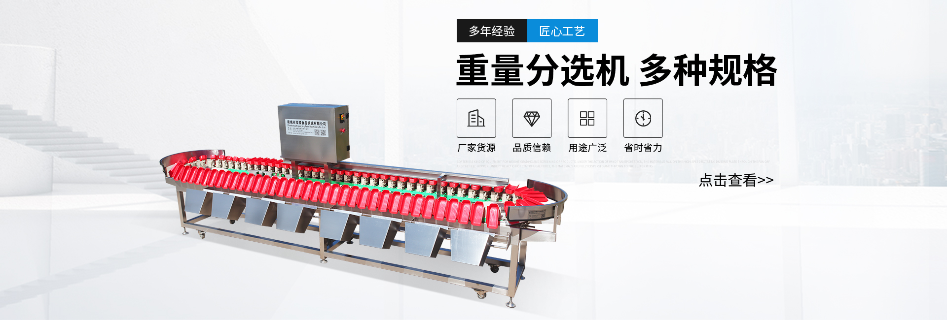公司主要致力分選機的研發和設計,并獲得多項專利,有皮帶式稱重分選機、托盤式稱重分選機,廣泛應用于食品、水產、電子、中藥等各種需要精確分選的行業,并獲得了廣大客戶的好評。